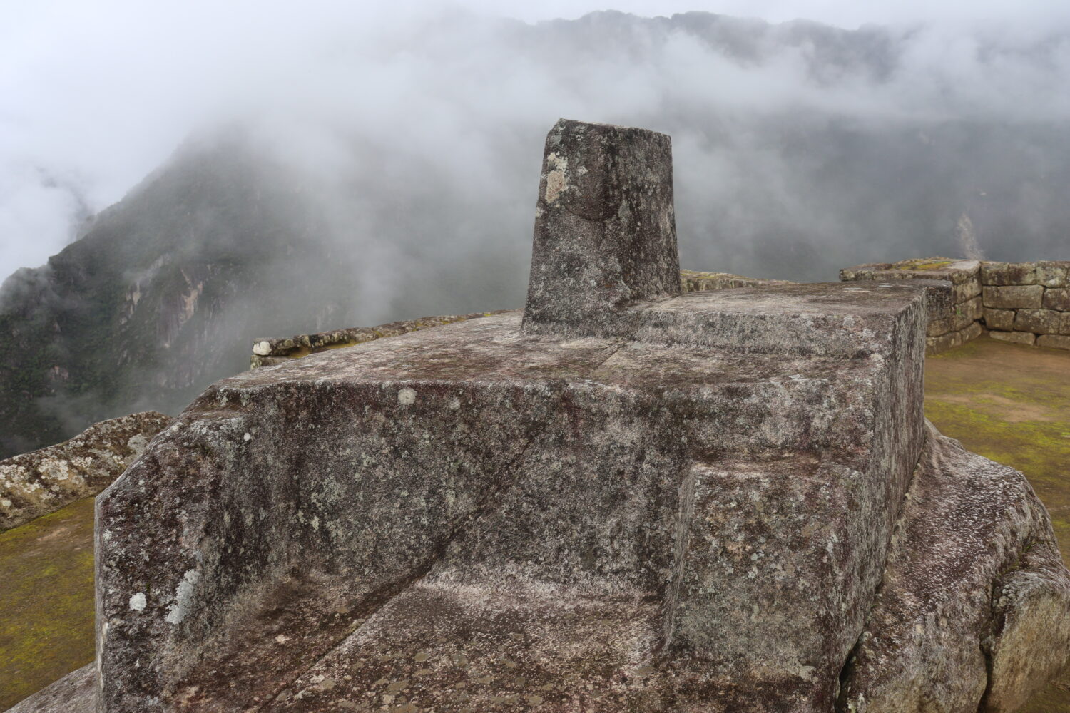 さて広間を通り抜けて階段を登ると、マチュピチュ遺跡の中でもっとも標高の高い場所に存在するインティワタナを見ることができます。インティワタナとは太陽を繋ぎ止める石という意味で、中心に東西南北を指し示す角柱のある石です。この石は太陽暦を利用したインカ人が日食によって太陽が消えないようにする儀式を行なったとか、日時計として使われたとか色々な説があります。