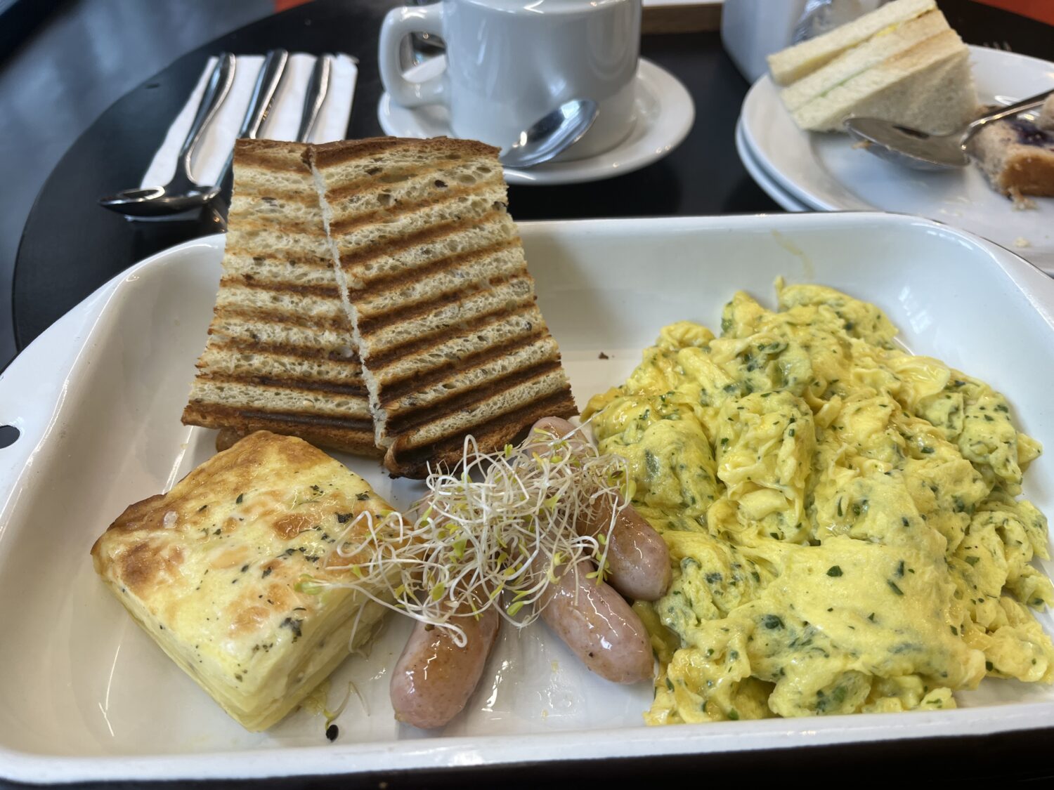 From the farmってい朝食をorderポテトのハムを挟んだやつ。バジルで味付けされたスクランブルエッグ。ソーセージ。