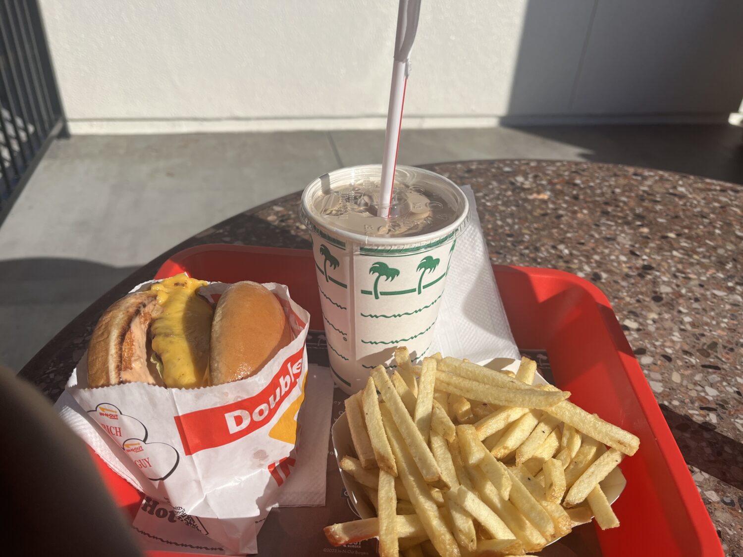 Double-DoubleというIN-N-OUT burgerの看板バーガーに、ナポレオンシェイクっていう0、色々な味を全部混ぜたシェイク、それにポテト。値段は結構良心的で1500円ぐらい。これが一番美味しい。これはアメリカ人ハンバーガーばっか食べるようになるわけだと思いました。
