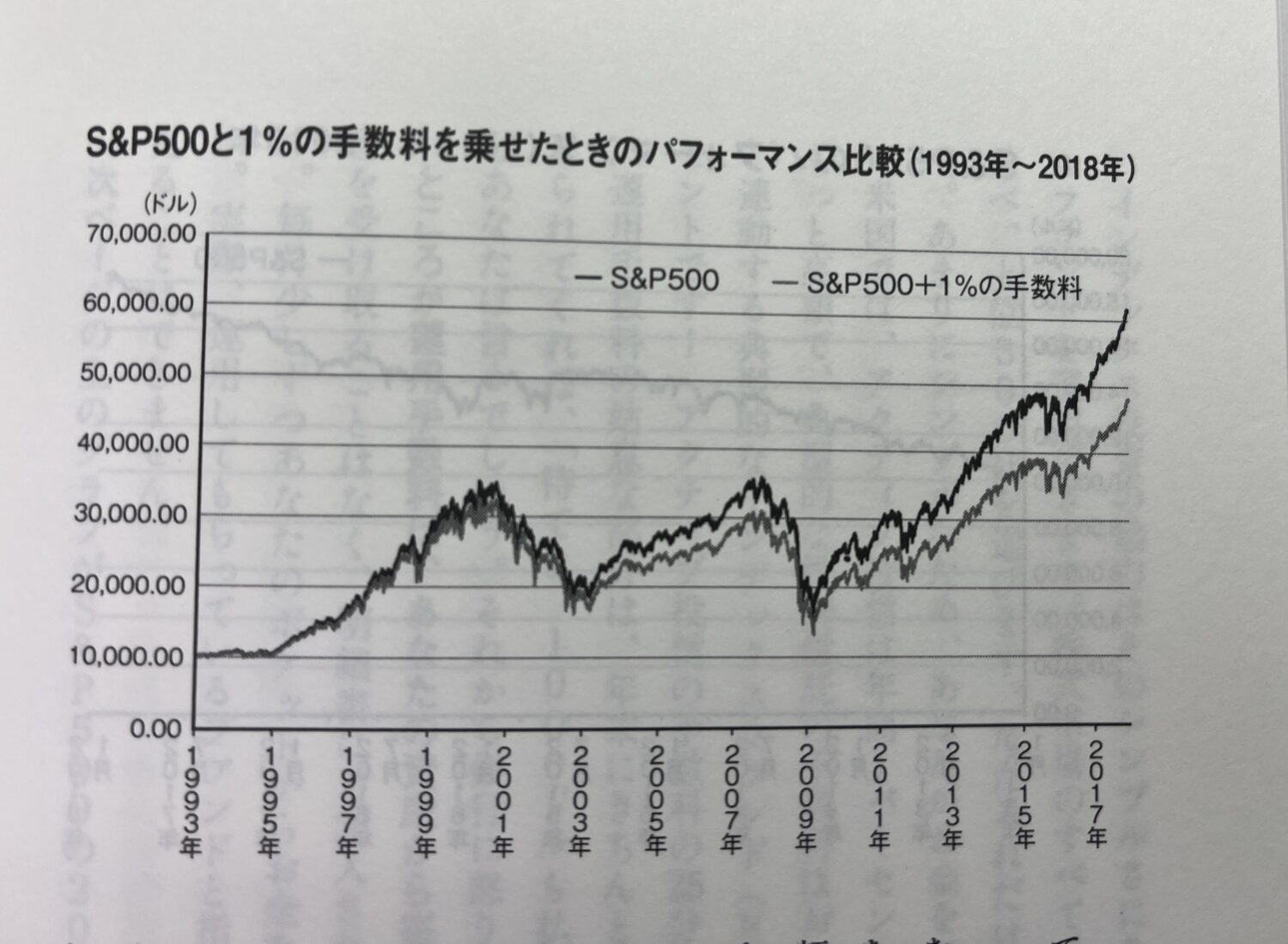 このグラフはS&P500という有名なアメリカのインデックスファンドの資産の純粋な推移と1%手数料を取られたときのすいいを示し他ものです。10年ぐらいでは大した差になっていませんが20年とか25年とかになるととんでもない差になります。