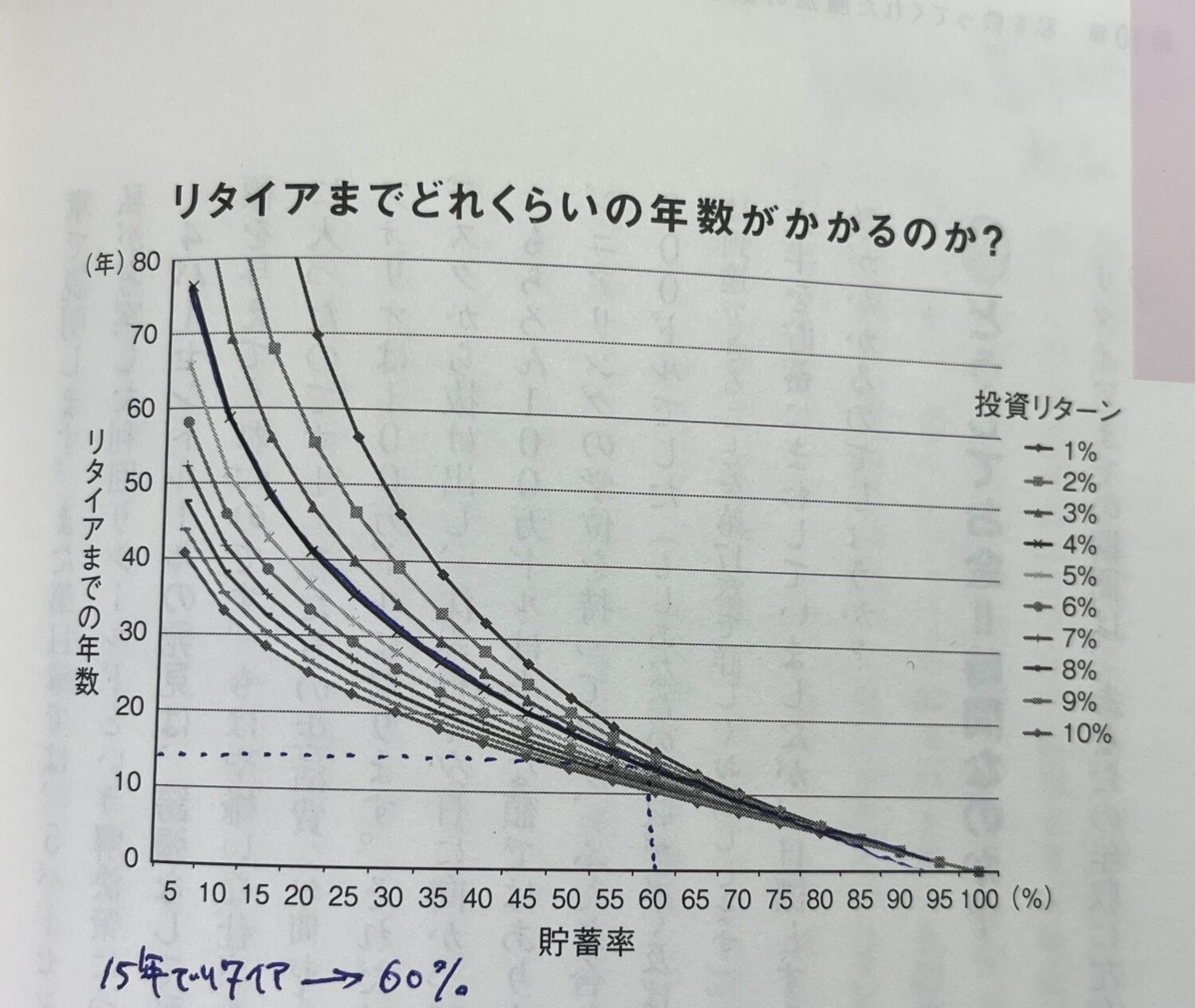 またこの図からは貯蓄率が35%以下の場合リタイアにかかる年数が指数関数的に長くなるということもわかります。